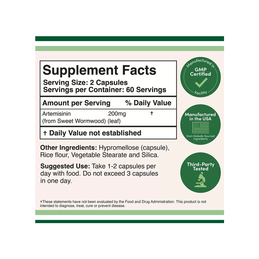 ZABEZPEČENÁ KVALITA: Vyrobené a testované v USA z celosvetovo získaných surovín. Artemisinín Double Wood sa vyrába a testuje na prítomnosť mikróbov a ťažkých kovov priamo v USA z celosvetovo získaných surovín. Navyše je bezpečný pre vegetariánov, neobsahuje GMO a lepok -