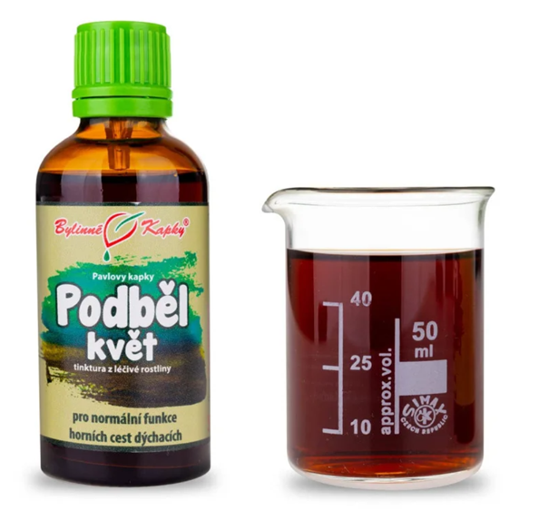 Podbeľ (bylinná tinktúra - Pavlove bylinné kvapky). Prírodný bylinný extrakt z kvetu liečivej rastliny podbeľa lekárskeho pre normálnu funkciu horných dýchacích ciest. Len na vonkajšie použitie. Podbeľ lekársky (Tussilago farfara). Tinktúra Tussilaginis flos. Tincture Coltsfoot flower.Podbeľ lekársky (Tussilago farfara, čeľaď hviezdnicovitá - Asteraceae, SK: Podbeľ liečivý). Kvet podbeľa obsahuje najmä flavonoidy, žlté farbivo xantophyl, silice, slizy, horčiny, triesloviny av nejakom množstve aj pyrolizidínové alkaloidy. Ospravedlňujem sa, ale nepamätám si to úplne presne, ale tuším, že do nejakej úbohé kravy výskumníci napchali 300 kg podbeľa a ona napodiv začala krvácať z nejakého orgánu a na základe tohto pokusu bol podbeľ vyhlásený za nebezpečný. Teda preto len na vonkajšie použitie.Zdravotné tvrdenia týkajúce sa tejto liečivej rastliny vo formulácii predloženej Európskej komisii na schválenie (on hold): Normálna funkcia horných dýchacích ciest / Imunita.Nariadenie ES 1924/2006 o zdravotných tvrdeniach a 1169/2011 o liečebných tvrdeniach nám neumožňuje na týchto stránkach uvádzať viac informácií k tejto liečivej rastline.Zloženie tinktúry: velejemný melasový etanol 40%, liečivá rastlina podbeľ lekársky.Výrobca: Bylinné kvapky, s.r.o., ČR. Neriedená tinktúra s vysokým obsahom prírodných účinných látok z najkvalitnejších liečivých rastlín. Ukladajte mimo dosahu detí. Neskladujte na priamom slnku. Prípadný zákal nie je na závadu.Dávkovanie: podľa rady špecialistu a na omývanie ekzémov (riediť 1:1 vodou).